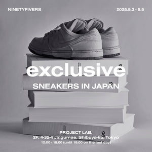 日本にゆかりのあるスニーカーをアーカイブした図録『exclusive: SNEAKERS IN JAPAN』の出版を記念し、NINETYFIVERSはPOP-UPを開催します。日本市場で初めて国内限定のスニーカーやショップ別注が発売された1995年を起源に、各メーカーが日本企画モデルやコラボレーションを競ってリリースし始めた2000年代以降、更にスニーカー市場が成熟を遂げていった現代に至るまで、本書に収録されたアーカイブはおよそ1500足。奇しくも日本ゆかりのスニーカー年表の起源とした1995年は、NINETYFIVERSの由来となったナイキエアマックス95の誕生年であることから、エントランスにナイキエアマックス95をディスプレイ。併せてスニーカーカルチャーの日本史を彩る貴重なデッドストックを展示することで『exclusive: SNEAKERS IN JAPAN』の世界観をビジュアルで表現します。