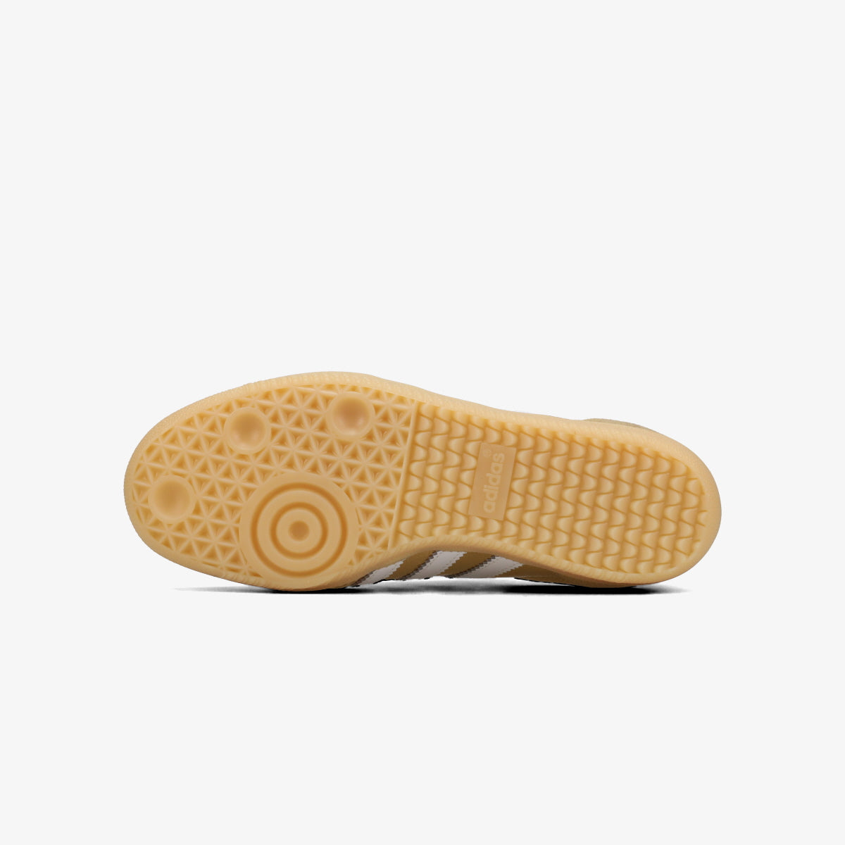 アディダス自慢のサンバのオリジナルモデルをベースに、シルバーメタリックカラーのひび割れ加工を施したクラックドレザーアッパーを用いた、遊び心のあるバージョン。