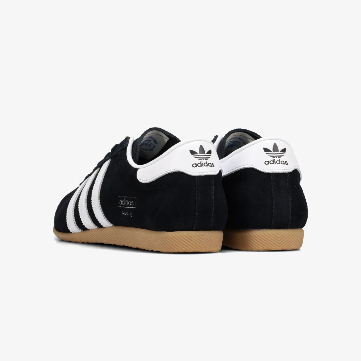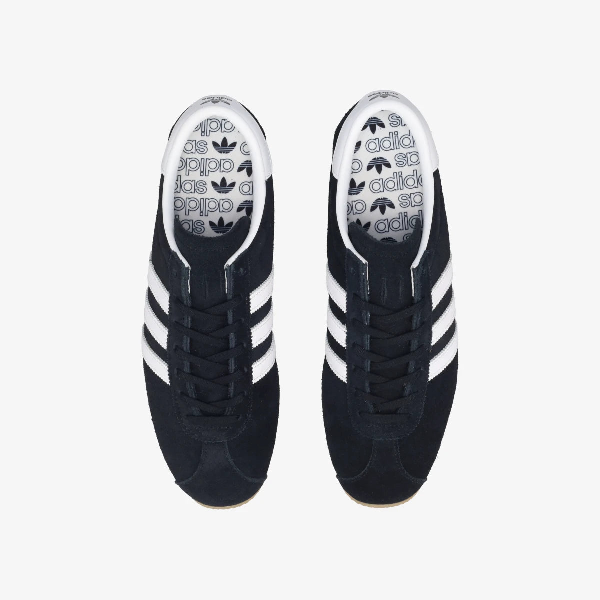 滑らかなレザーアッパーに、ゴールドフォイルのロゴが映えるクラシックな佇まいの一足。