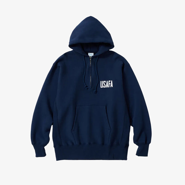 1960年後期より、アメリカの消防法に基づきコットン100%の裏起毛素材が危険と判断され、ポリエステルやアクリル、レーヨンが含まれるようになった経緯がありました。この商品は、その時代を経た1970年後期に使用されていたアクリル混の「REVERSE WEAVE(R)(リバースウィーブ(R))」を復刻したシリーズのハーフジップフーデッドスウェットシャツです。当時の混率を忠実に再現したコットン90%・アクリル10%。旧式のシンカー編み機で編み立てた独特のボリューム感と風合いが特長です。胸のプリントの「USAFA」はアメリカ合衆国の空軍士官学校(United States Air Force Academy)をモチーフにしたもので、1970年代にChampion(チャンピオン)ブランドが同校に供給していた商品のデザインをそのまま採用しています。ファスナーは1893年に世界で初めてファスナーを発明した米国TALON社製。スライダーはメカ式ロック登場以前の手で押さえて止めるカムロックタイプで、復刻ではなく1960年代以降の貴重な実物のストックを使用しています。ネームタグは1970年代モデルの「青単タグ」(青単色タグ)。左袖にCロゴワッペンが付いていない点も当時の仕様そのままです。アメリカの空軍士官学校は、士官候補生が正規士官として勤務するために必要な能力やリーダーシップ、知識を育成する4年制の学校。卒業生は理学士(Bachelor of Science)の学位を取得し、空軍少尉もしくは宇宙軍少尉に任官します。
