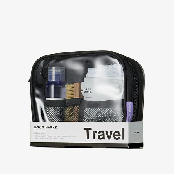 どこにでも持ち運び可能なジェイソンマークトラベルキット。このキットには旅行に最適なサイズの、2oz.プレミアムディープクリーニングソリューション、ミニプレミアムクリーニングブラシ、マイクロファイバータオル、クイックワイプスが3枚入っています。専用のケースは耐久性の高いリップストップナイロンを使用し、伸縮性を生かしたメッシュポケット付きです。さらに機内への持ち込みやすさを考慮し、外からでも中身が確認できるクリアウィンドウを採用しています。