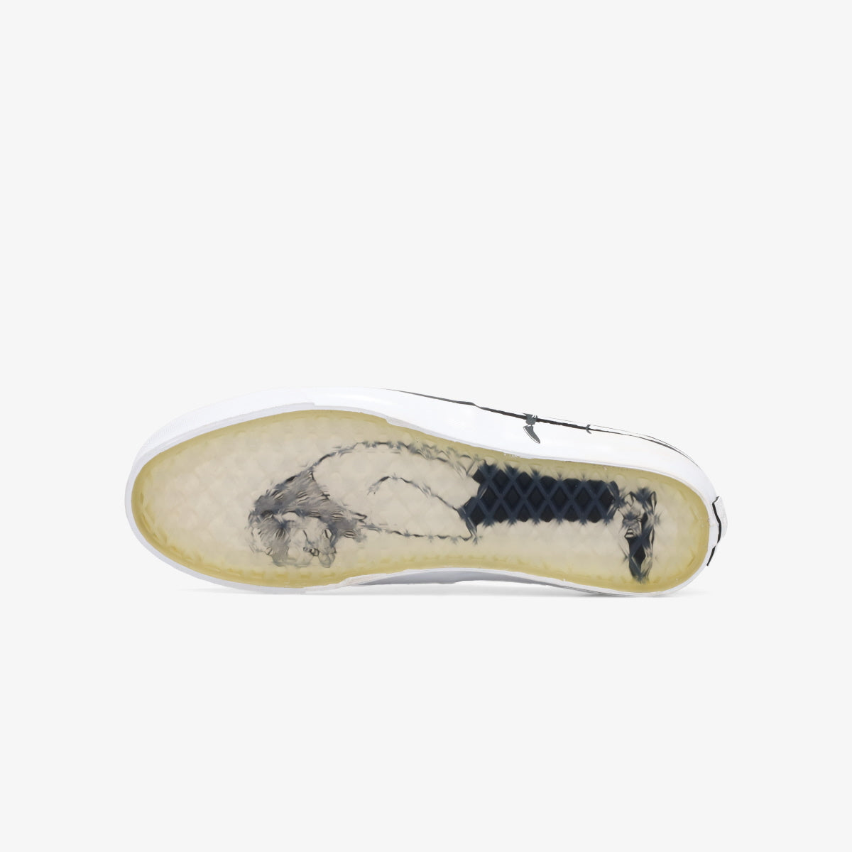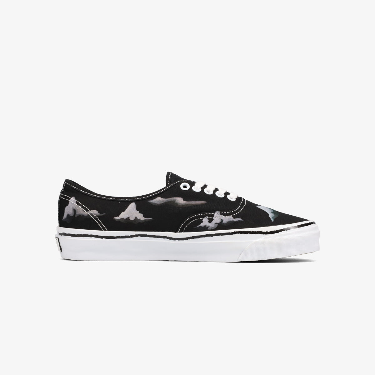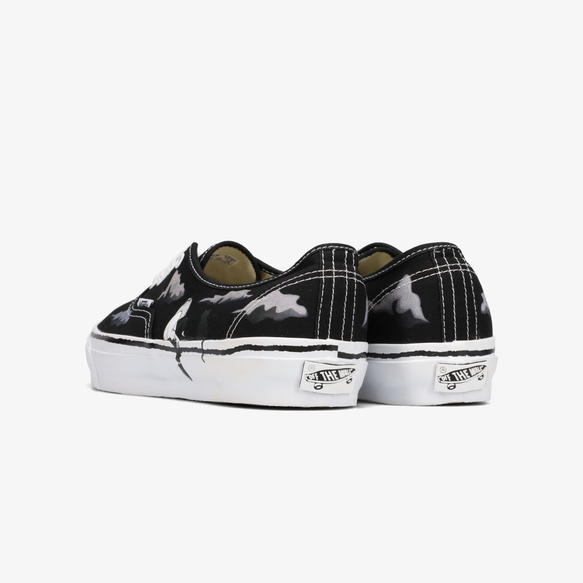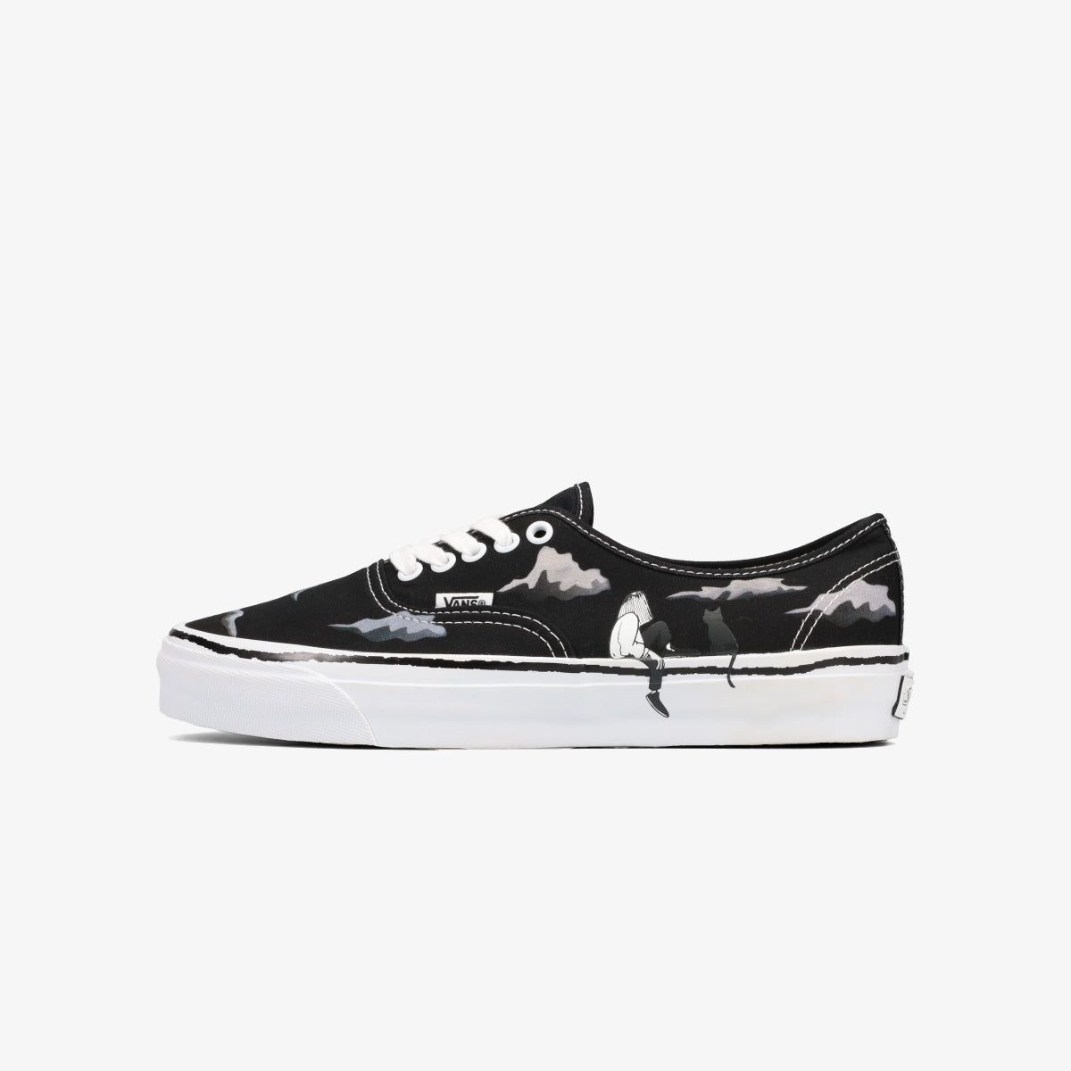VANS AUTHENTIC 44をベースに、たなびく雲とそれを眺める人物と猫のモチーフをアッパーとフォクシングテープにプリント。またフォクシングラインは手描きのデザインで表現され、クリアラバーのワッフルアウトソール越しにアートワークが透けて見える仕様に。