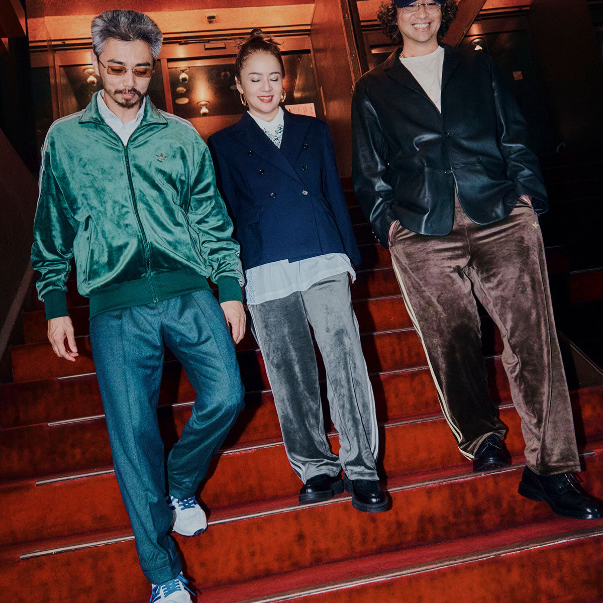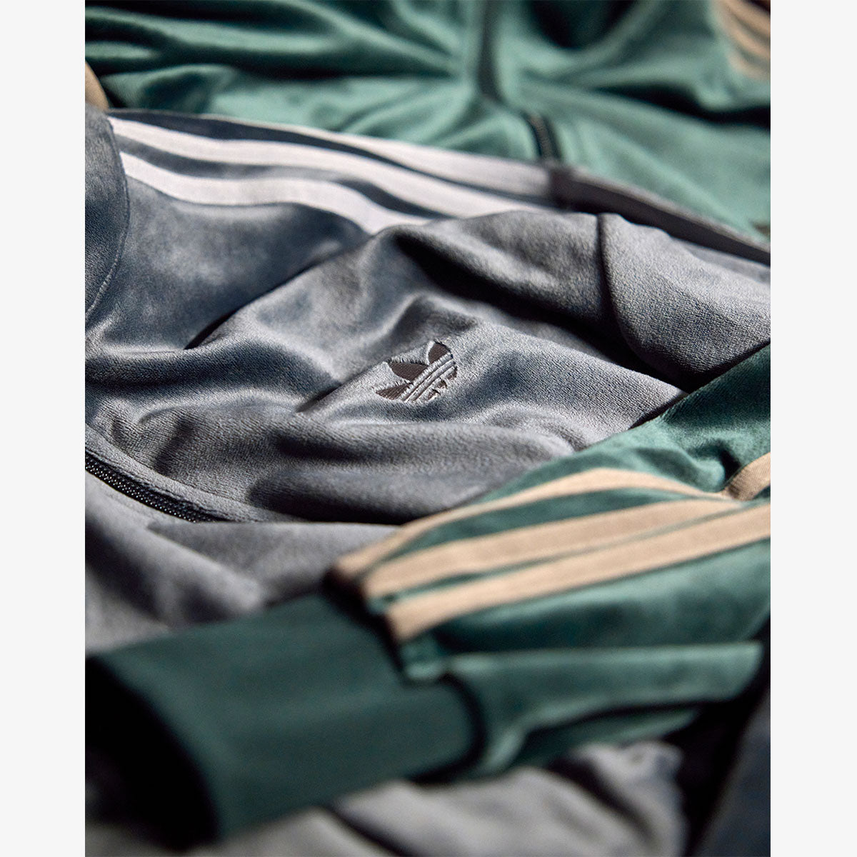 現代のスタイルに合わせたシルエットで、クラシカルな雰囲気を醸し出すベロアを採用し、よりレトロ感のあるトラックスーツに仕上がっています。