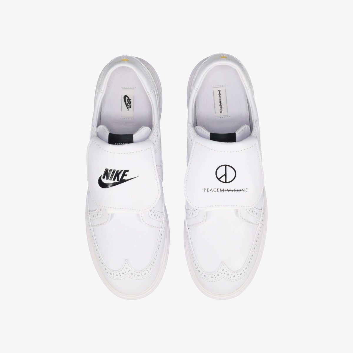 It was teased on G-DRAGON's own Instagram. This product, named "KWONDO1", has a white base with a Swoosh that resembles a wingtip and a brogue (patterned hole) style that resembles a dress shoe. The "PEACEMINUSONE" logo is placed on the tongue cover, and the brand's signature daisy flower is placed on the heel. Furthermore, the outsole also features a daisy design.
