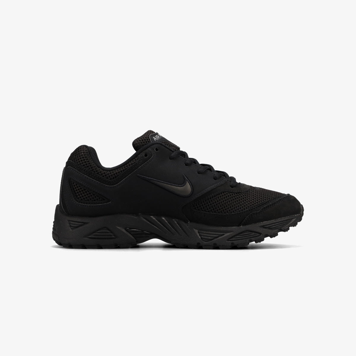 アッパーは、ブラック1色で構成されているが、メッシュ、レザー、合成繊維という異なる素材の組み合わせにより、単調にならない陰影とテクスチャの重なりが表現されています。
