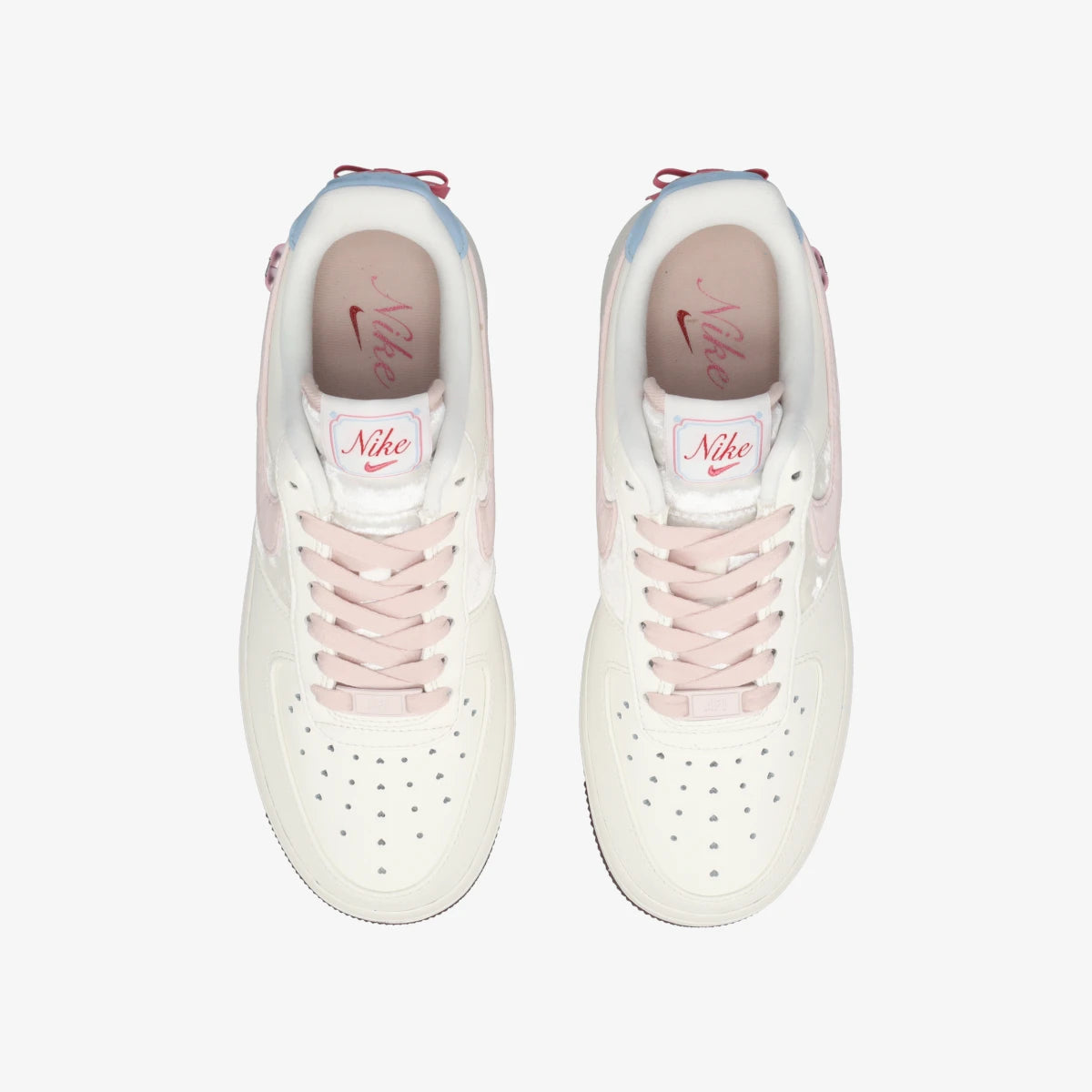 つま先の通気孔はハート型でパンチング、ヒールサイドにはハートのアクセサリー、ヒールにはピンクのリボン。
