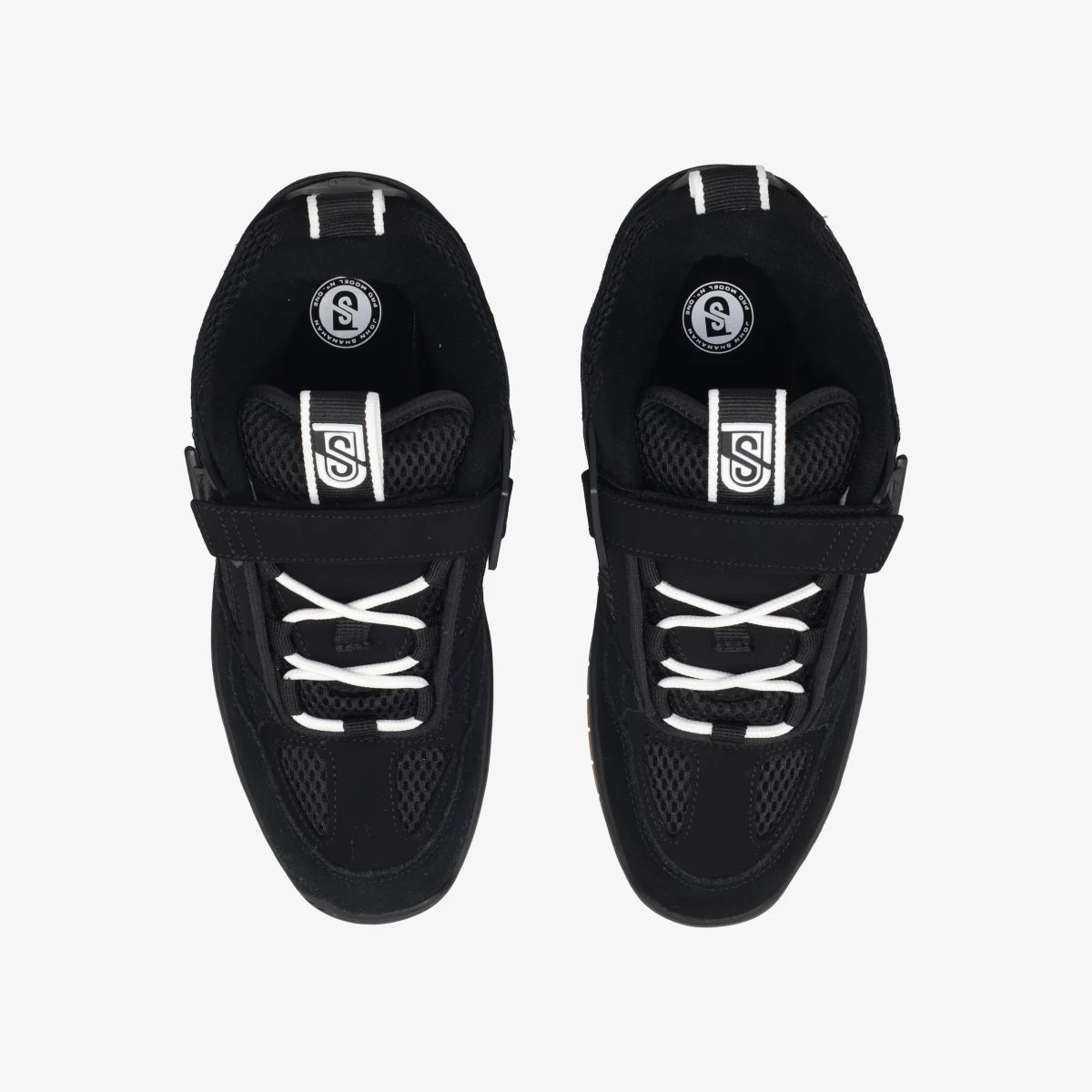 オールブラックのアッパーとミッドソールにガム色のアウトソールを組み合わせたスケート感満載の一品です。