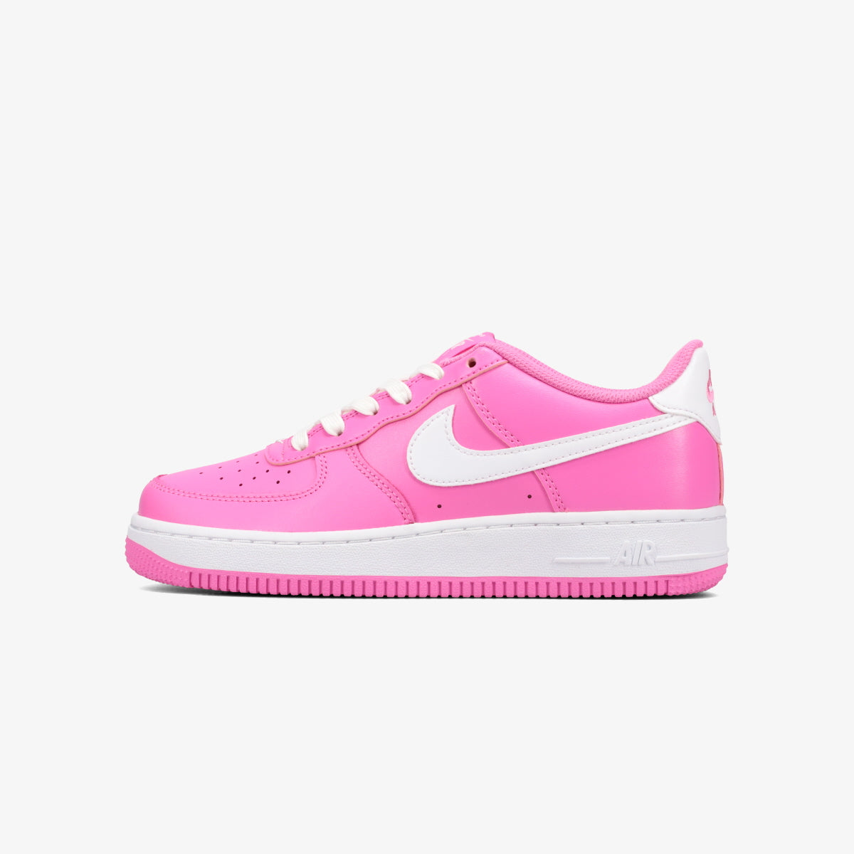 The side Swoosh, midsole, and outsole are white, creating a striking contrast with the pink.