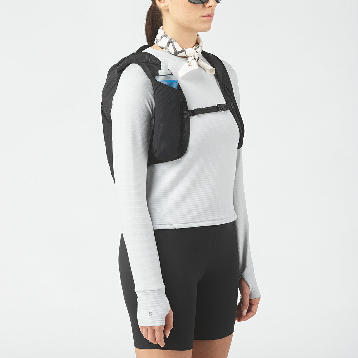 新しいハーネスポケットと 500ml ソフトフラスク(付属)に加え、収納力を高め、バックパネルを改良したこのオールインワン 10L バックバッグなら、ペースダウンの心配もありません。