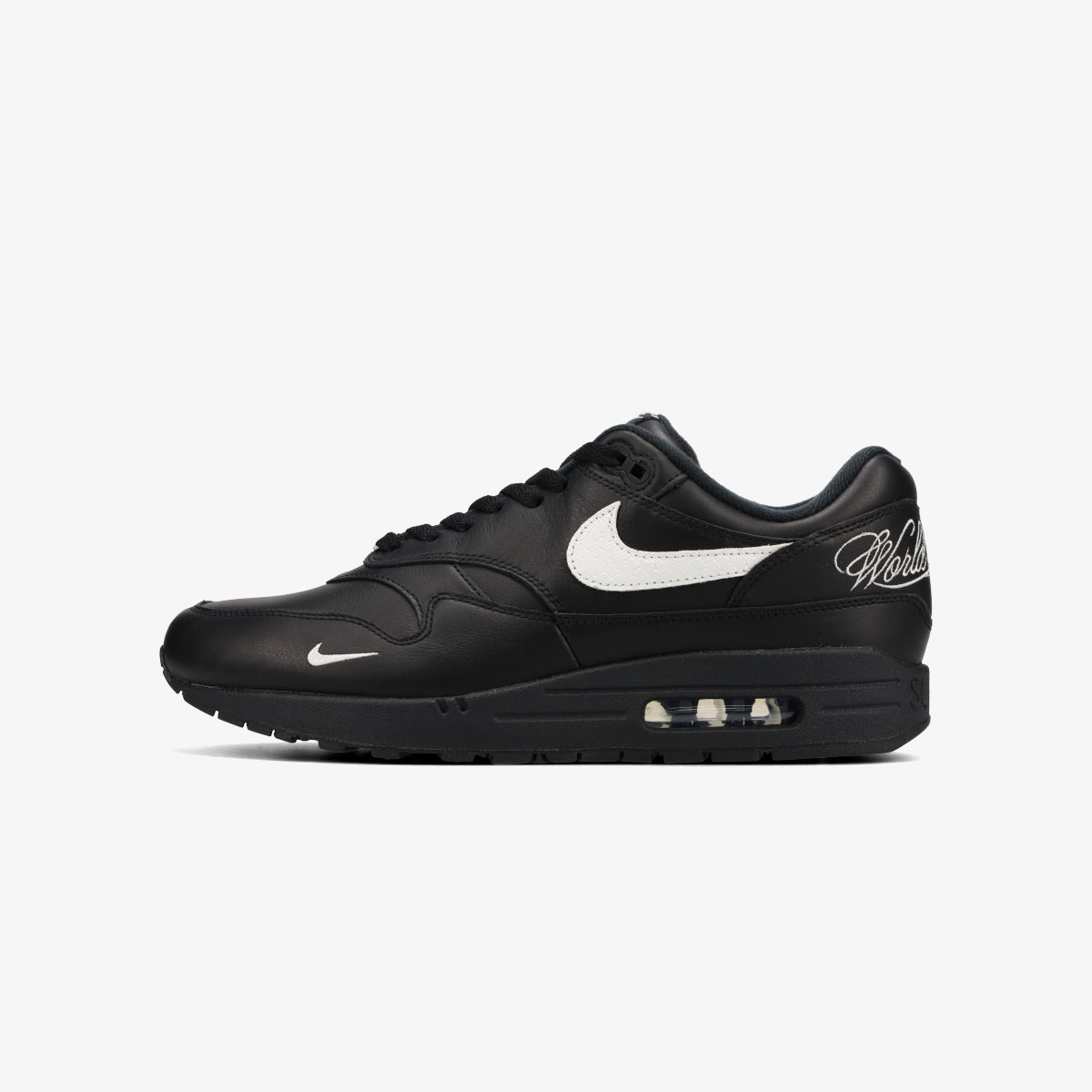 スネークスキン柄のスウッシュとブラックレザーのコントラストが、コラボならではの味を出している。