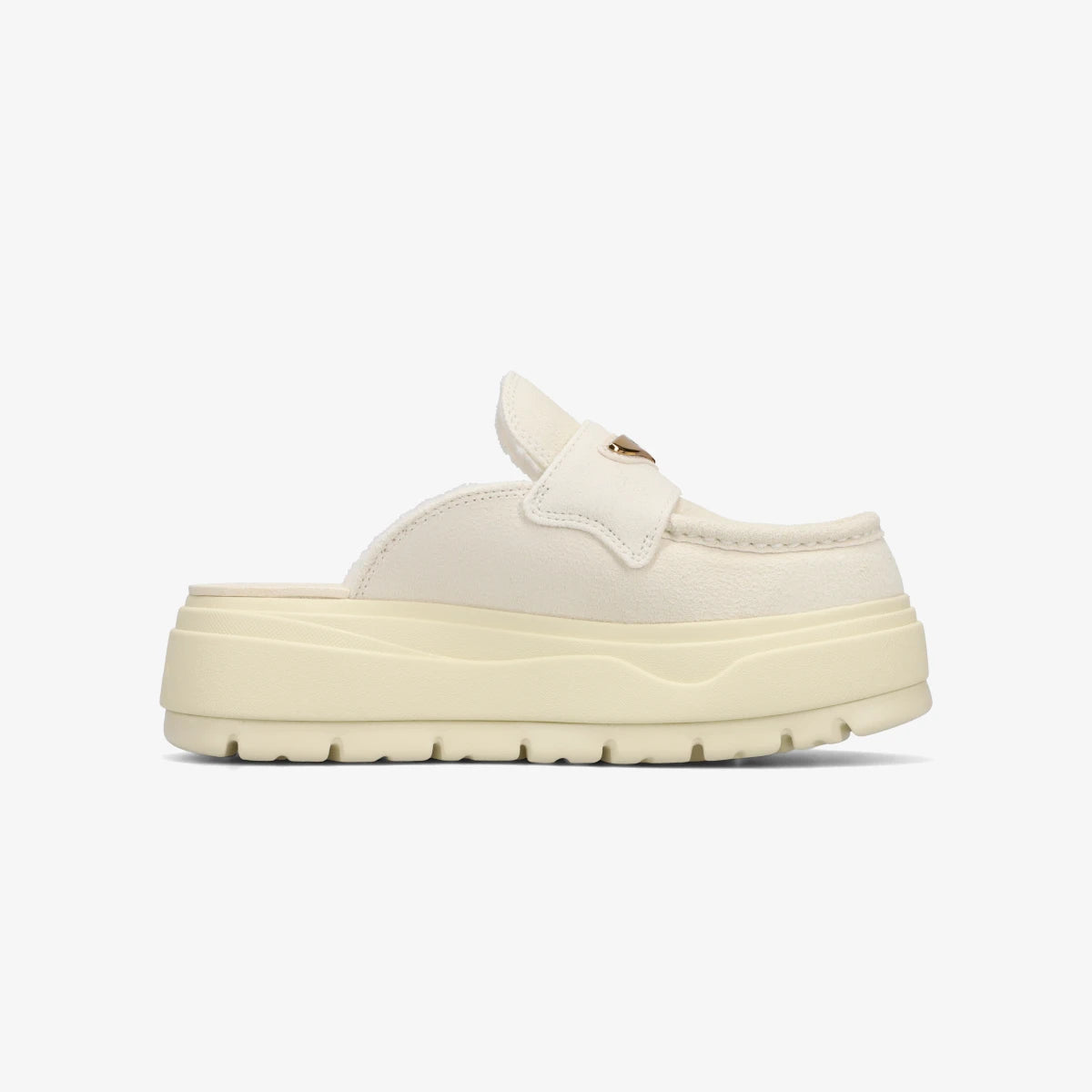 スエードのアッパーに配されたメタルのアクセントが、上品さを高めています。