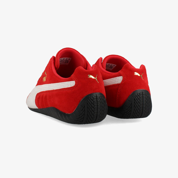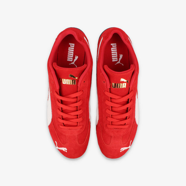 SPEEDCATは25年以上に渡って、スピード、精密さ、比類のなきパフォーマンスの代名詞であり、レーシングカルチャーのシンボルでした。もともと耐火性を備えたFormula 1®のフットウェアとしてリリースされたモデルですが、モナコのトラックを飛び越え、今や世界のファッション中心地のストリートへと進出しました。そのSPEEDCATが今再び柔らかいスエードと高級レザーを用い、オリジナルの赤と黒のカラーウェイで登場。前足部には新しいPUMAキャットロゴを備えています。