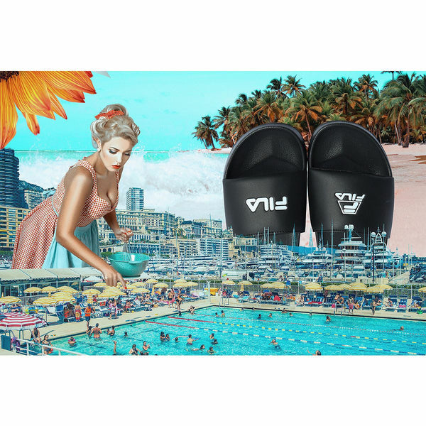 <KICKS LAB.>と<FILA>両者にとって初となる今回のコラボレーションは、<FILA>の人気スポーツサンダルである<DRIFTER 96>をベースモデルとして採用しました。ビーチやプールサイド、アウトドアなどのレジャーシーンからストリートまで、幅広い場面にフィットするこのモデルを、<KICKS LAB.>のテーマカラーでもある「ブラック&ホワイト」にて大胆にカラーリング。アッパーには左足に<FILA>の定番フォントロゴ、右足に90年代に使用されていたレトロロゴをプリントし、コラボレーションモデルならではのオリジナルな仕様が要所要所に盛り込まれています。