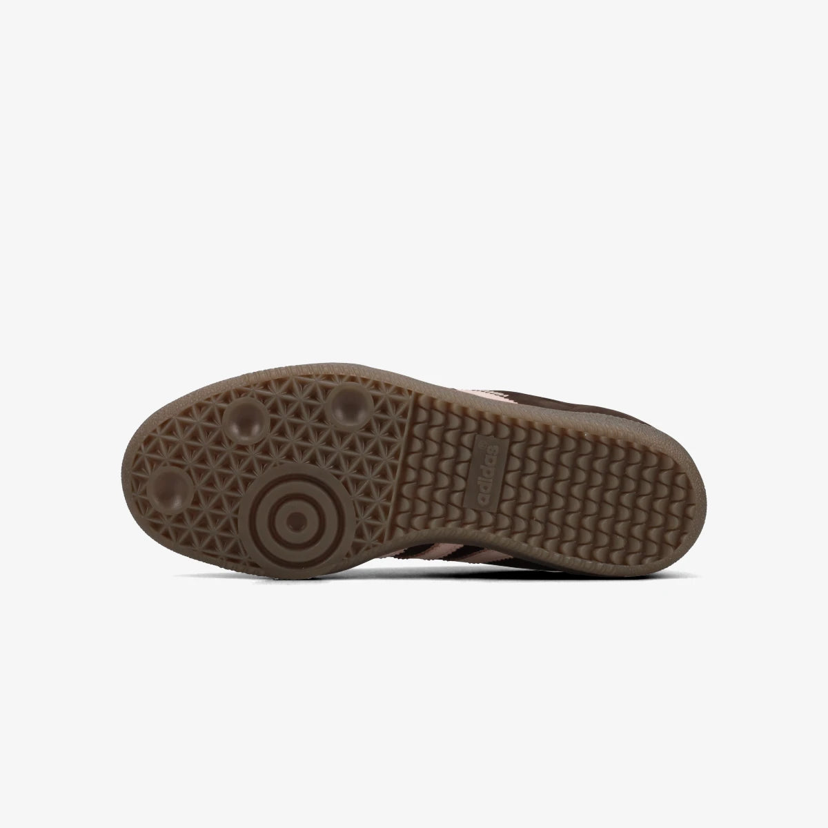 ギザギザのスリーストライプスと側面にプリントされたサンバの名前が伝統の雰囲気を醸し出し、レザーシュータンにプリントされたトレフォイルのロゴラベルはアディダスのレガシーを物語っている。